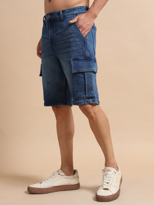 Men's Blue Cargo Denim Shorts – Knitted Dobby Lycra | Utility Edition